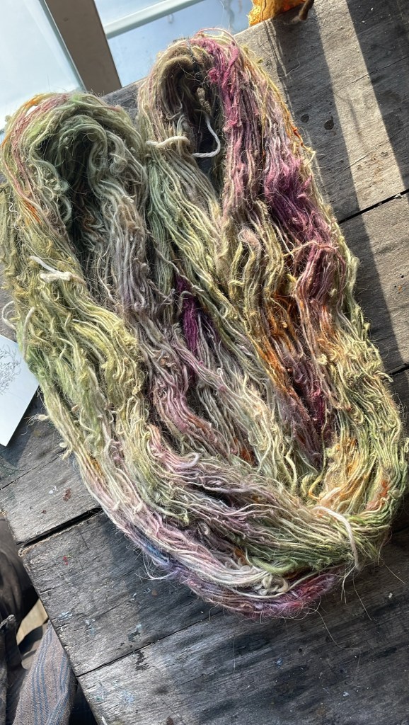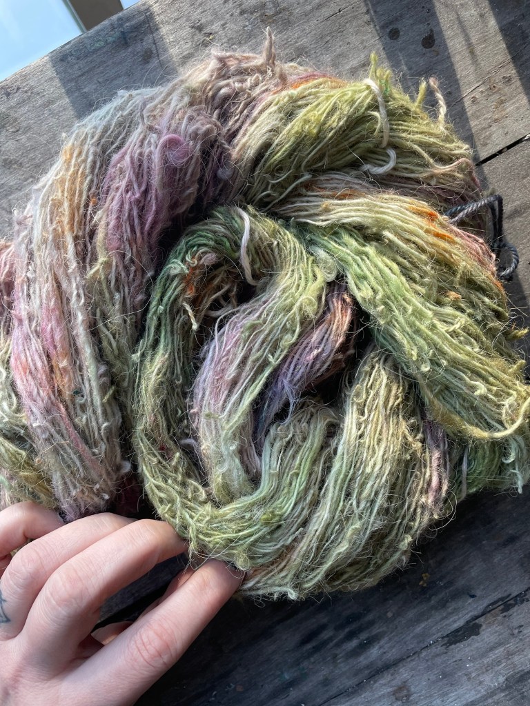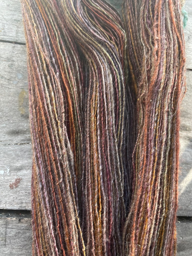 Ici vous trouverez des écheveaux de laine qui ont été traités, teints et filés par mes soins. Ces fils sont uniques et le résultat de beaucoup de travail. Parfois les teintures sont naturelles, parfois ce sera des teintures acides. Quoi qu’il en soit, le tout sera indiqué, et le prix évidemment reflète le travail derrière ces brins magnifiques.